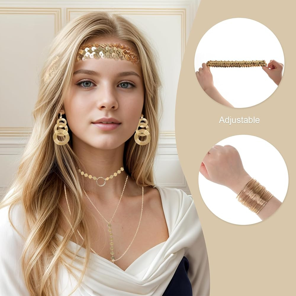 70s Disco Accessories Set: This disco accessories women set includes 1 layered necklace, 1 pair of rimless diamond cut sunglasses, 2 different styles of gold bracelets, 1 pair of disco dangling earrings, 1 sequin hair band, plenty of quantity, delicate and elegant appearance, fully able to meet the needs of attending all kinds of disco parties and daily matching.