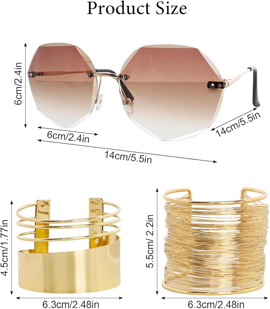 Suitable Size: The height of the two bracelets in this set is 5.5cm/ 2.2in , 4.5cm/1.77in respectively; the total length of the two lenses is 14cm/5.5in, the length of the individual lenses is 6cm/2.4in, the width of the lenses is 6cm/2.4in, the length of the frames is 14cm/5.5in; the necklace is 13+2inch extension; the earrings are 8.5cm/3.34in long; the circumference of the hair band is 40cm/15.7in. Suitable for most of the body shape people, please refer to the pictures for detailed size