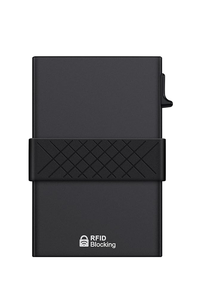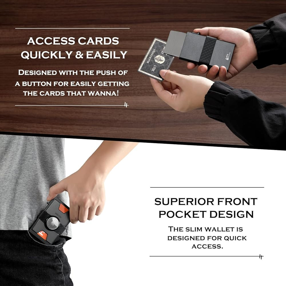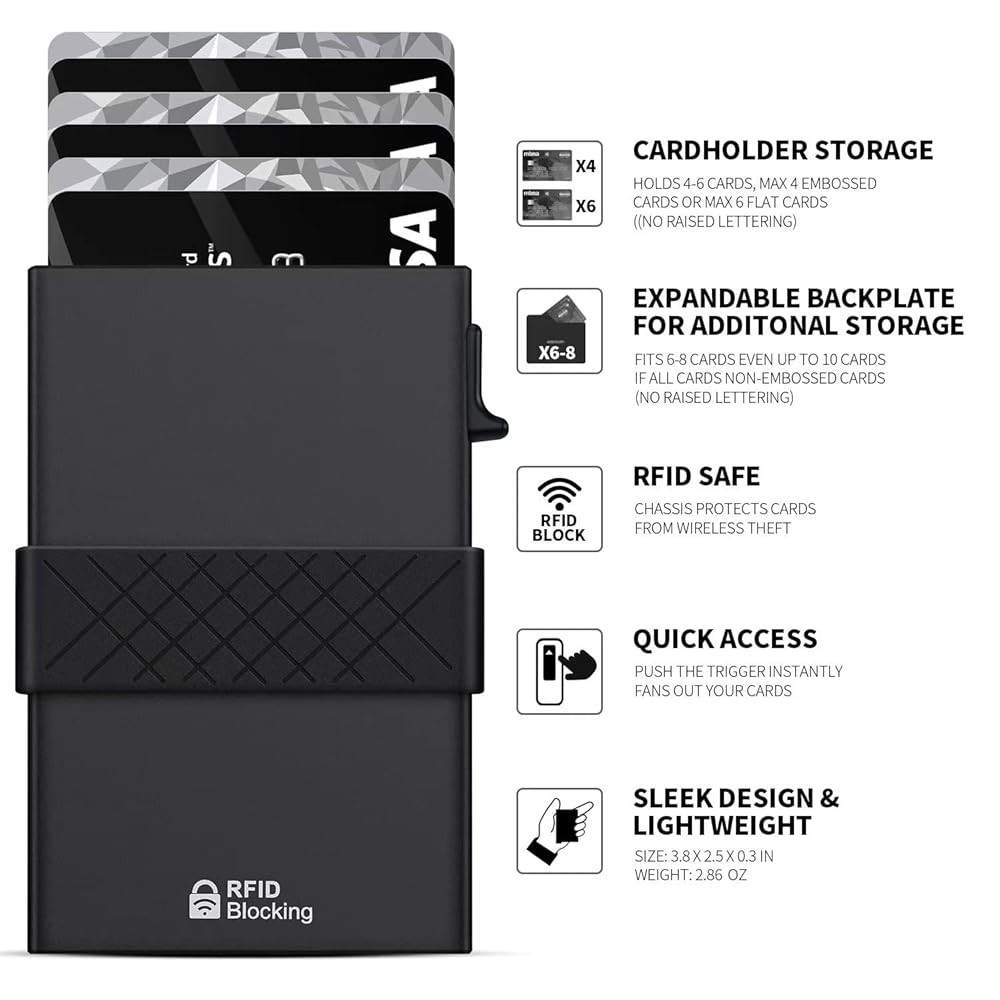 【QUICK POP UP ACCESS & LARGE CAPACITY】 : Simply press the switch on the side of pop-up aluminum case, you can quickly access to your cards. The metal case can hold up to 6 cards (no raised letters), the outside backplate can hold another 6 cards, thus can hold 12 cards in total.