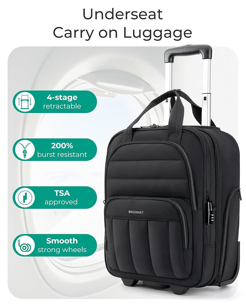 BAGSMART Underseat Carry on Luggage with Wheels, 16-inch Under Seat Luggage, Lightweight Travel Luggage Travel Suitcase for Women, Personal Item Bag, Black