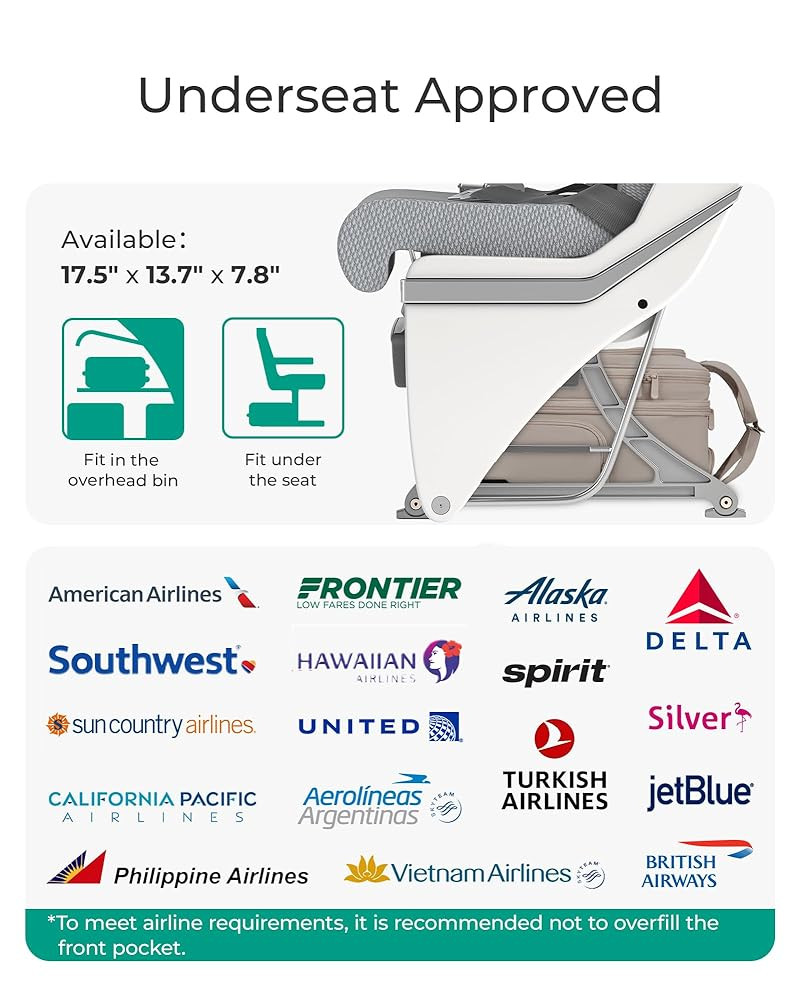 • Airline-Approved: This rolling underseat luggage complies with the personal item size requirements of most airlines, it would easily and comfortably fit under an airplane seat while maintaining convenient accessibility. Making it an ideal travel companion for avoiding the hassle of check-in queues. Dimensions: 17.5×13.7×7.8 inches