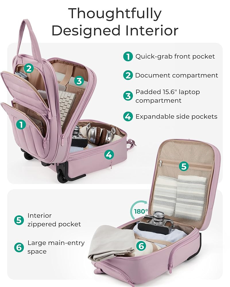 Organized Storage: Effortless organization is achieved with ample storage, internal compartments, and a small zippered pocket for smaller items. The padded laptop compartment fits up to a 15.6-inch laptop. Making it an ideal carry-on for 2-3 day overnight trips.