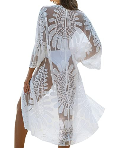 LACE FLORAL DESIGN - Featuring a stunning lace floral print, bathing suit cover up for women includes loose 3/4-length sleeves, a tie closure at the waist, and intricate lace trim detailing. The draped open front silhouette cascades into a straight mid-calf length hemline.