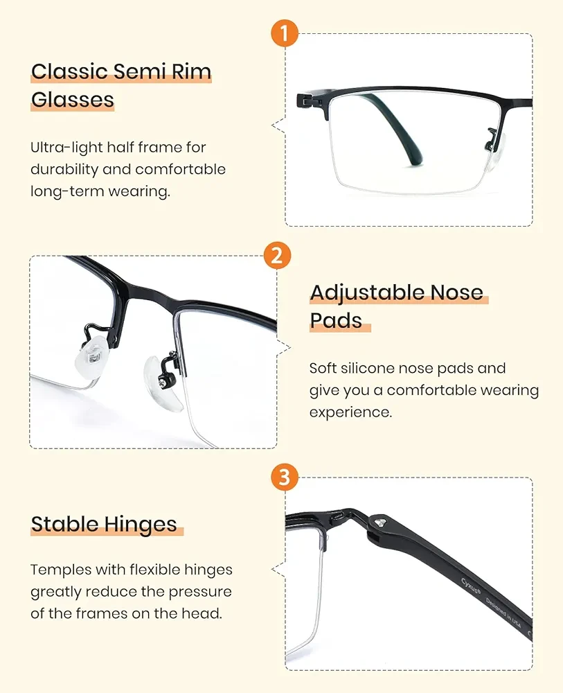 • ANTI FATIGUE: Cyxus anti-blue light glasses for men can block harmful blue light from electronic devices effectively such as computers, tablets, mobile phones, TV, game consoles, etc, and reduce eye fatigue. Great for office employees or anyone who needs to look at the screen all day.
