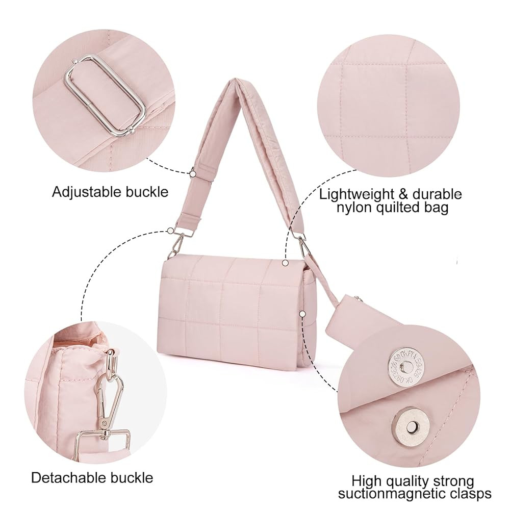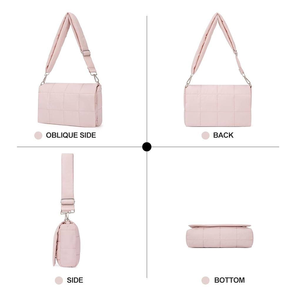【PREMIUM MATERIAL】:The Puffer crossbody bags for women is made of high quality nylon material and padded with cotton, simple shape but unique, which is soft to the touch, Water Resistant and durable.Puffer tote bag is soft and skin-friendly,This Bag is as soft as a pillow.