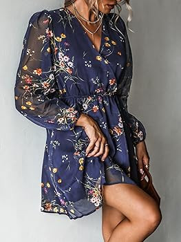 Details: A-line short dress wedding guest dress for women is perfect for summer 2025, crafted from chiffon and navy floral printed , surplice v neck, with snaps, elasticized waist, semi-sheer long sleeves, a line and mini length, A great sundress for women and you can take it to attend to your children's graduation or as a gift to your mother