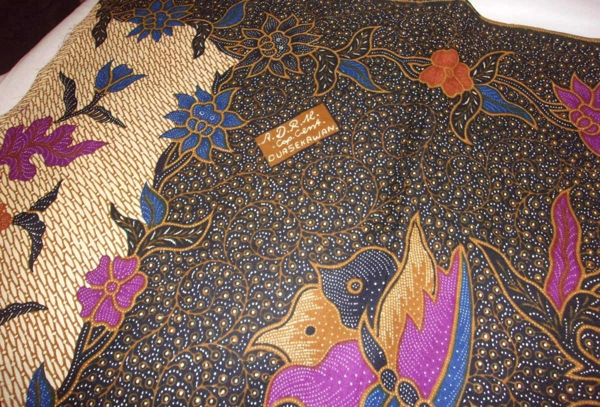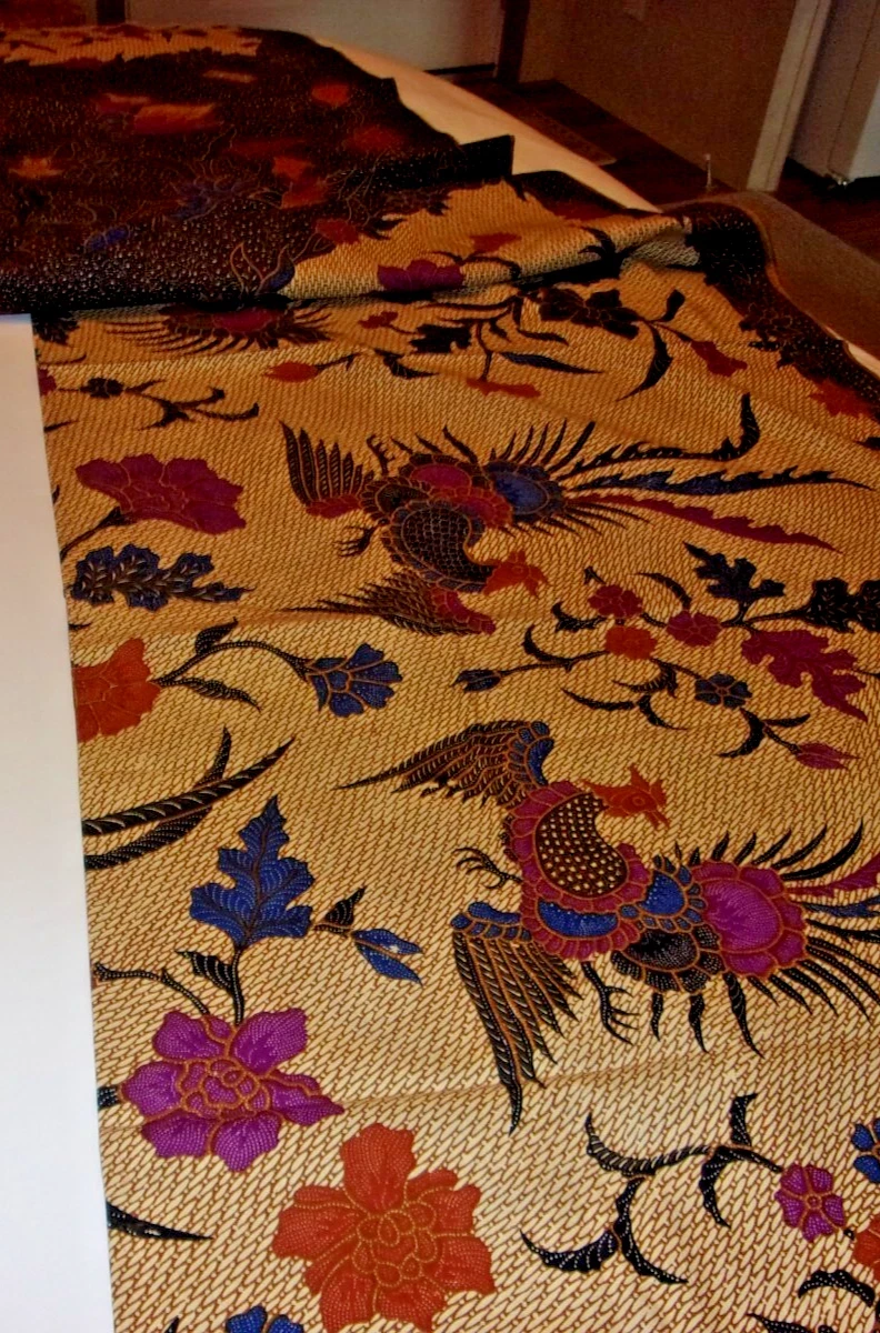 Fabric from Indonesia. 2 yards, new, unwashed. It is about 40" wide. Lovely colors of blue, purple, brown. Has exotic chickens.
