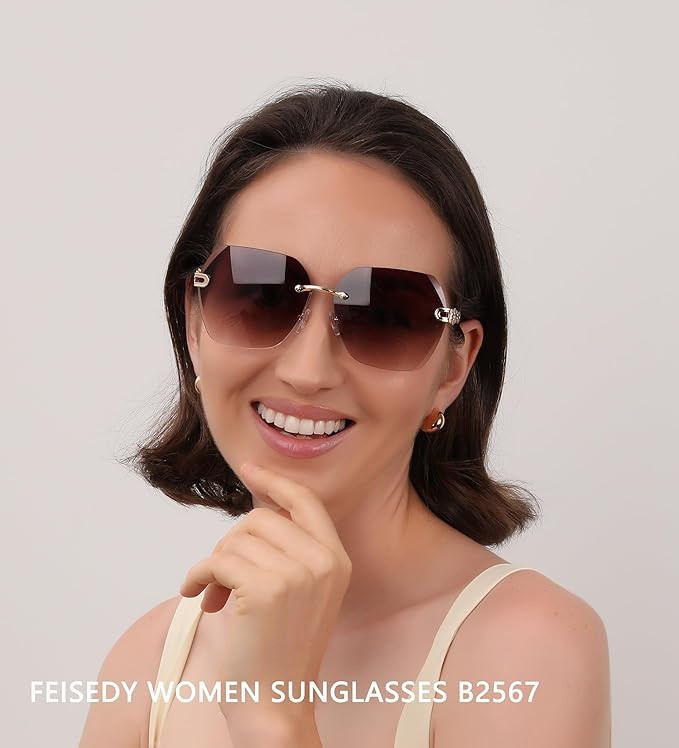 • Retro Designer Style -- FEISEDY Rimless Diamond Cutting Sunglasses Suitable for people pursue fashion and quality. Camellia Chain Temple Metal frames are made out of stainless steel, which is corrosion resistant, strong, stability and great shape.