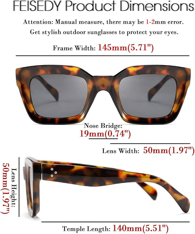 • FEISEDY Glasses Frame Width: 50MM(1.97'') Frame Height: 50MM(1.97'') Nose Bridge: 19MM(0.74'') Frame Length: 145MM(5.71'') Temple Length: 140MM(5.51'') Manual measurement, receice in kind prevail.