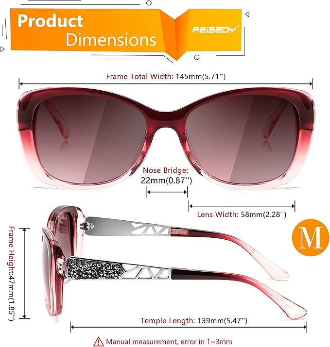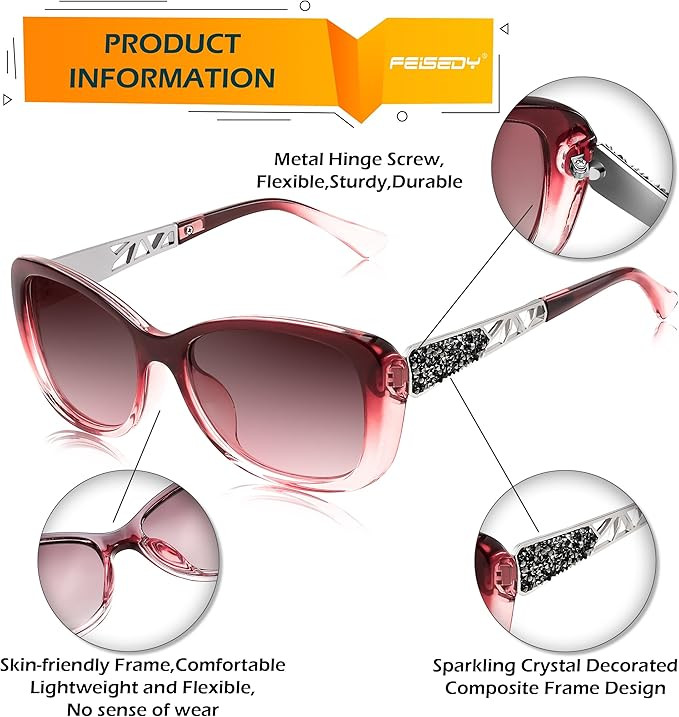 • 【High Quality Materials】Sunglasses for women is make of high strength polyester composite material makes glasses more wear-resistant and sturdy and comfortable to wear.Women sunglasses suitable for most facial shapes.