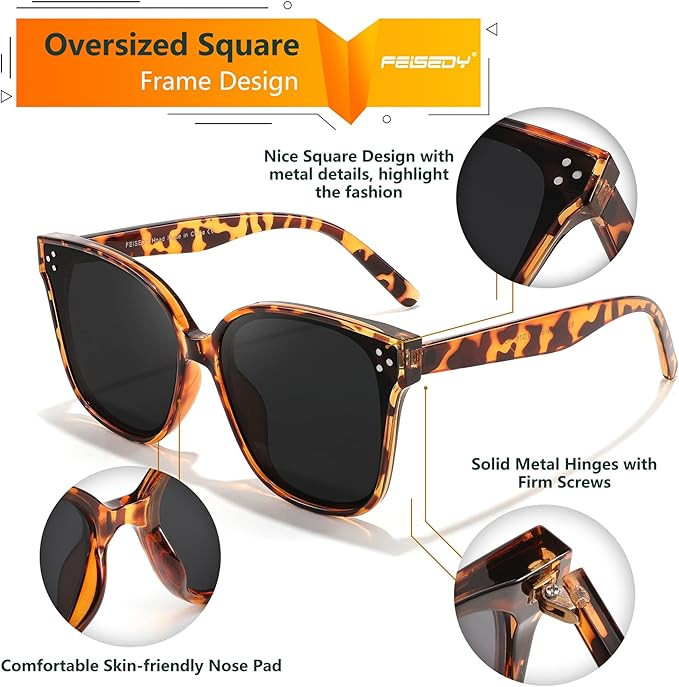 • FEISEDY RETRO Design-- Oversized Square Frame Design in minimalist style with embeded lenses, eye-catching, perfect fashion accessory to go with your outfits, a must-have sunglasses.