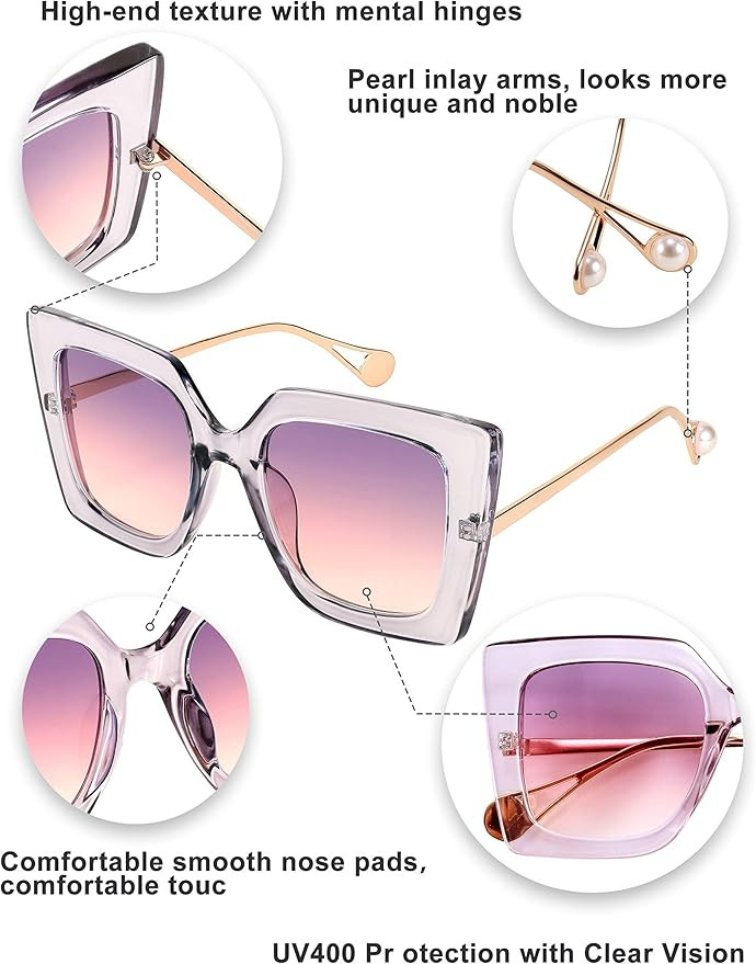• Unique design - This cat eye frame uses a comfortable nose pad design to reduce the pressure on your bridge of the nose without leaving indentations. And the shape of your face modified by the cat's eye frame; pearl inlay arms, looks more unique and noble, you can also be beautiful and confident wearing these sunglasses