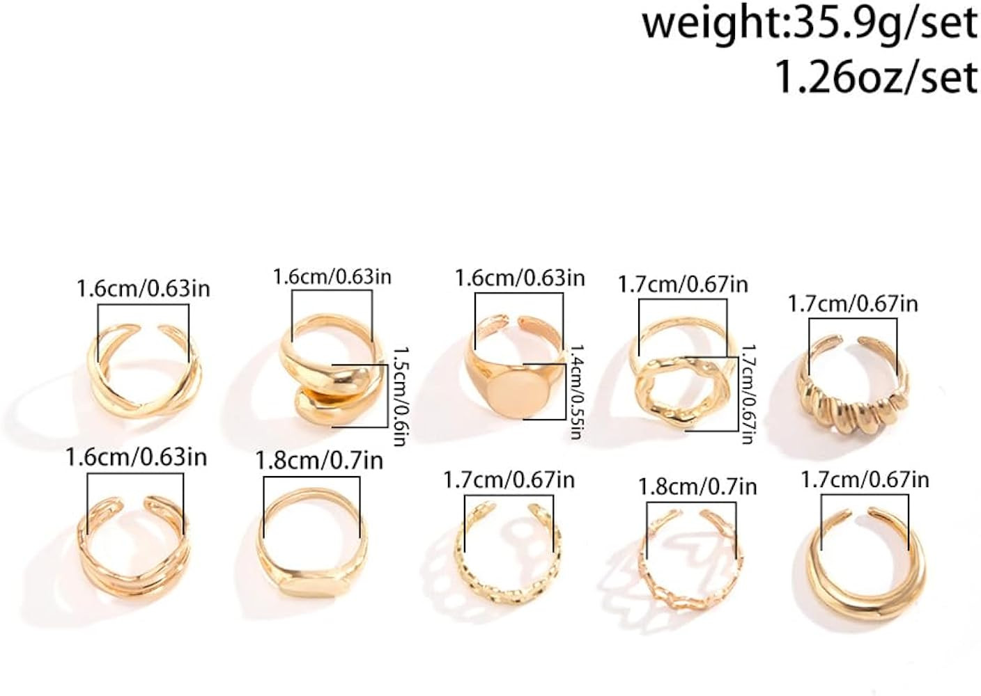 • Size:The inner diameter range of the ring set is 1.6cm (0.63inch) -1.8cm (0.71inch),because the gold joint ring is open and adjustable,whether it is a fat or thin finger, it can be worn successfully with the open design.