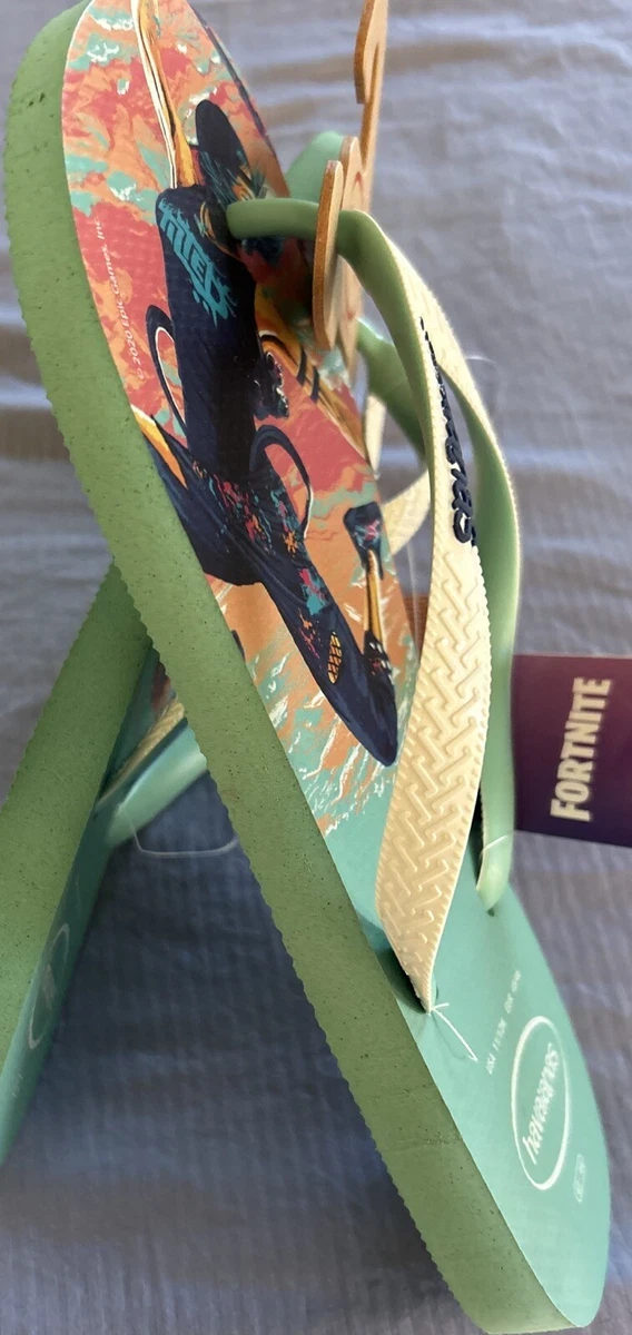 Elevate your gaming style with these limited edition Havaianas Fortnite flip flop sandals. The green dew design, featuring graphics from the popular Fortnite game, is perfect for casual occasions in the summer, fall, or spring. Slip them on with ease, thanks to the rubber straps and slip-on closure. These sandals are comfortable and waterproof, making them perfect for any adventure. The rubber outsole and lining material provide durability and comfort, while the insole is made of rubber for added support. With a standard shoe width and size 11.5 US / 12 AU / 12 UK / 43.5 EU, these Havaianas are perfect for any Fortnite fan.