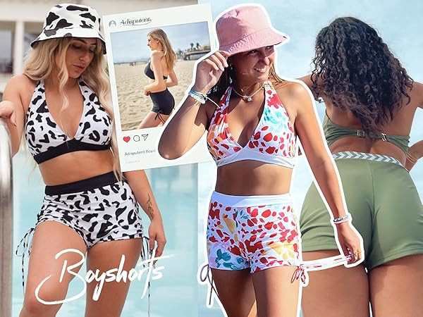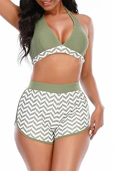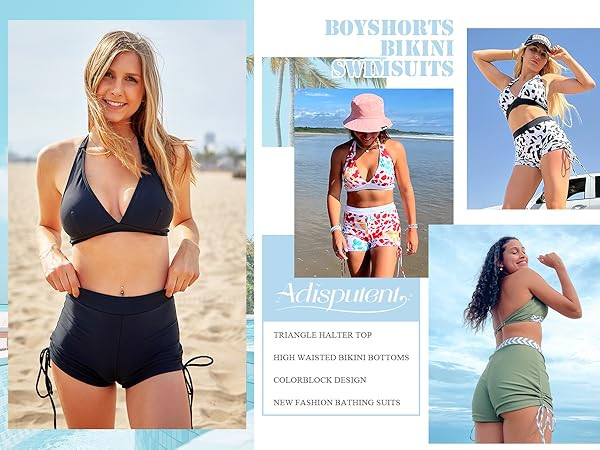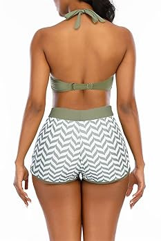 High Waisted Swimsuits with Boy Shorts Brazilian Triangle Top Stripes Halter Bikini Two Piece Bathing Suits