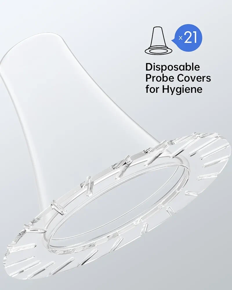 • Non-Contact More Hygienic - No contact with the probe during temperature measurement, with 21 replaceable disposable probe covers, replace the ear covers before each temperature measurement to prevent mutual infection among family members. Equipped with an upgraded storage case, the ear thermometer and replacement earmuffs can be stored together to isolate them from dust, making them more convenient and hygienic.