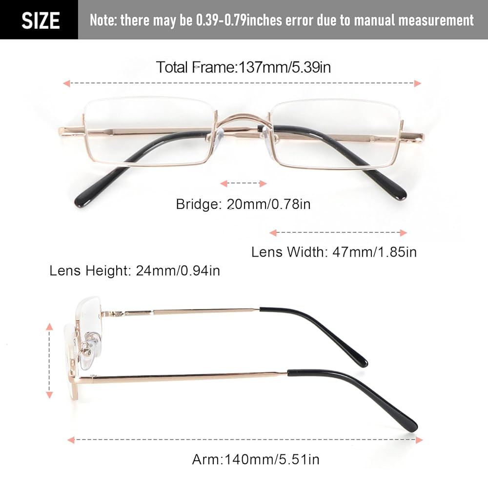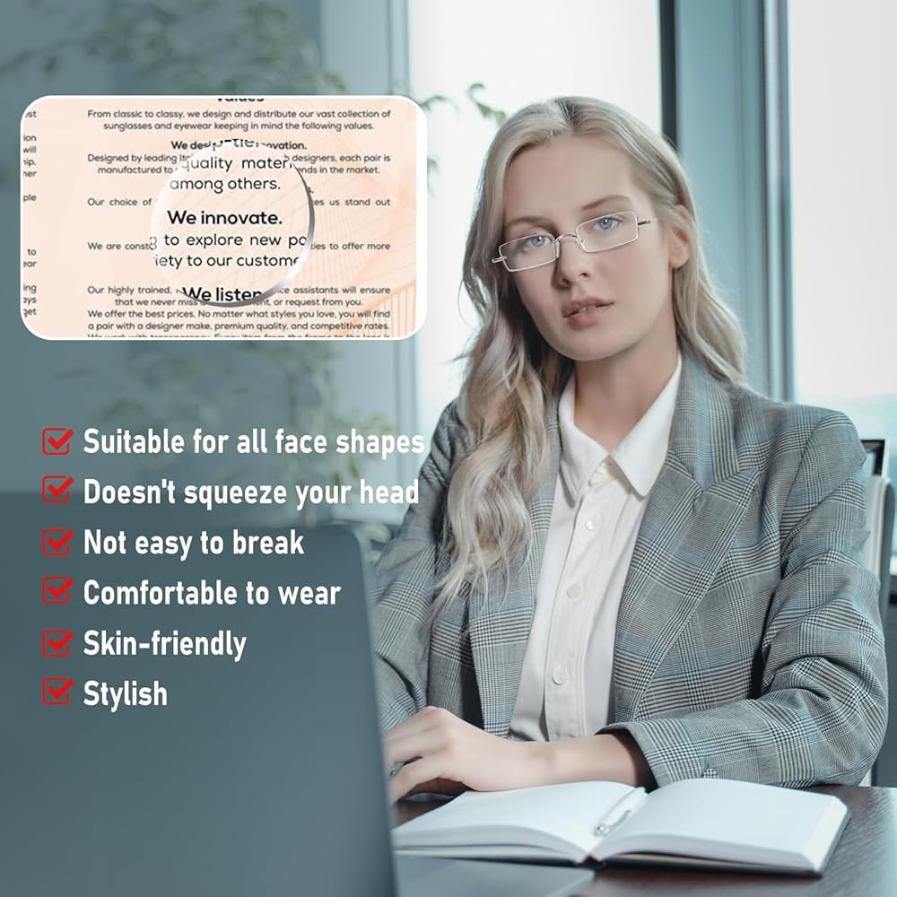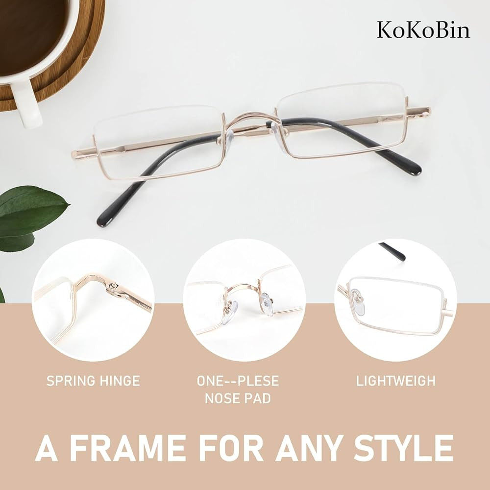 Lightweight small readers: They are inconspicuous on your face and very light, so you may not feel like you are wearing glasses. The slender frame and semi frameless silhouette provide an timeless classic style