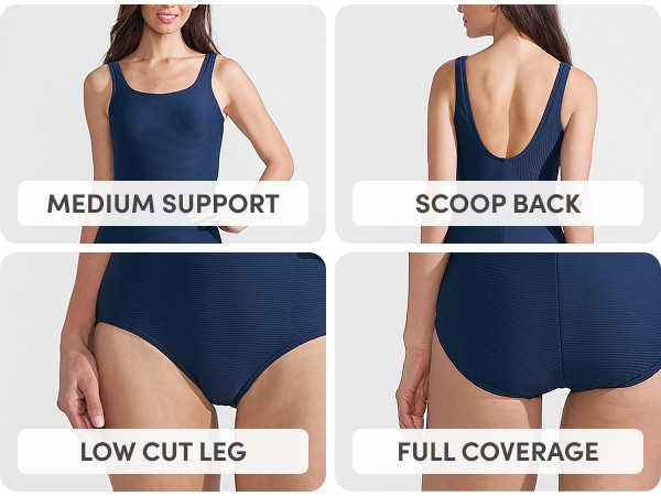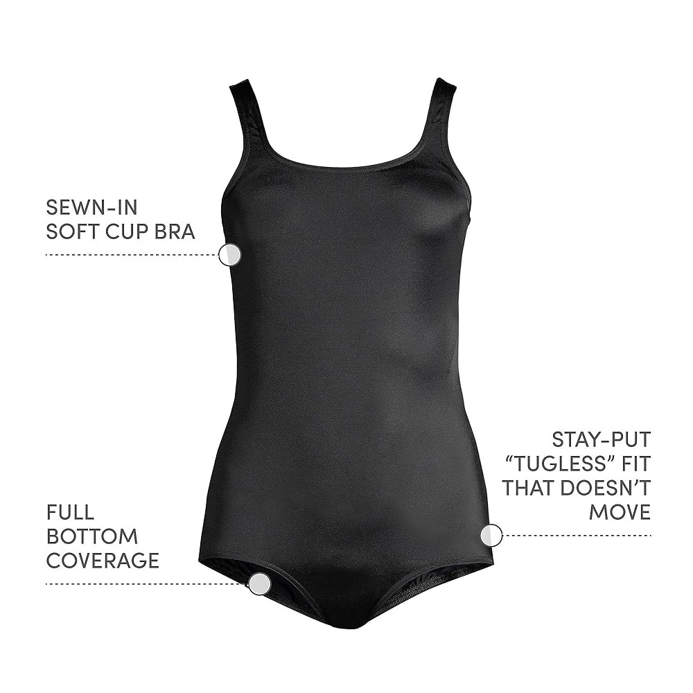 Athletic Support: Built-in soft cup bra adds comfort and support without underwire. Wide shoulder straps stay in place. High scoop neck in front and back. Tugless one piece provides a fuss free fit.