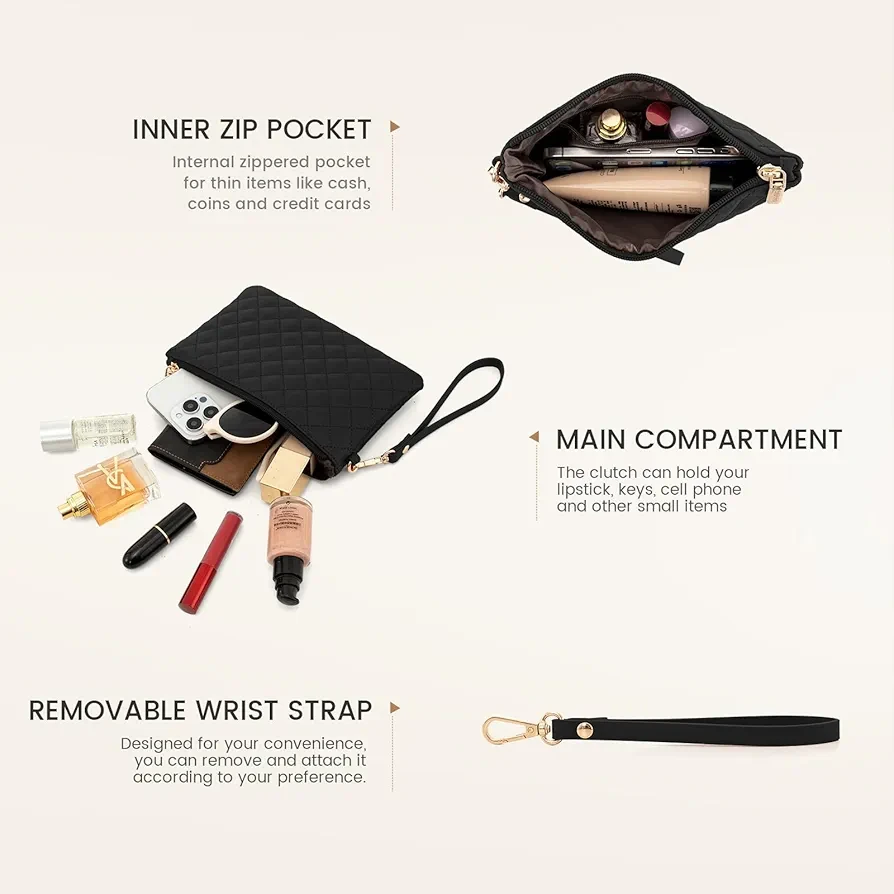 ? COMPLIMENTARY CLUTCH BAG ☛ The clutch purse is compact enough to fit in your hand or easily slip into a larger bag, yet spacious enough to hold all your essentials, such as your phone, keys, cards, and makeup.