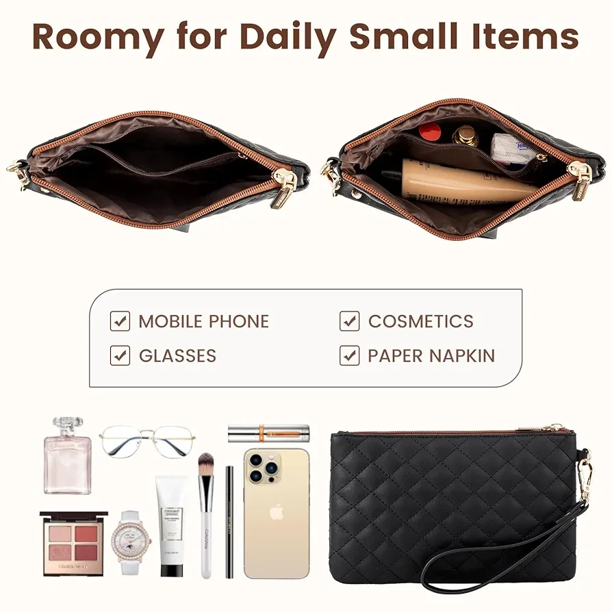 ? COMPLIMENTARY CLUTCH BAG ☛ The clutch purse is compact enough to fit in your hand or easily slip into a larger bag, yet spacious enough to hold all your essentials, such as your phone, keys, cards, and makeup.