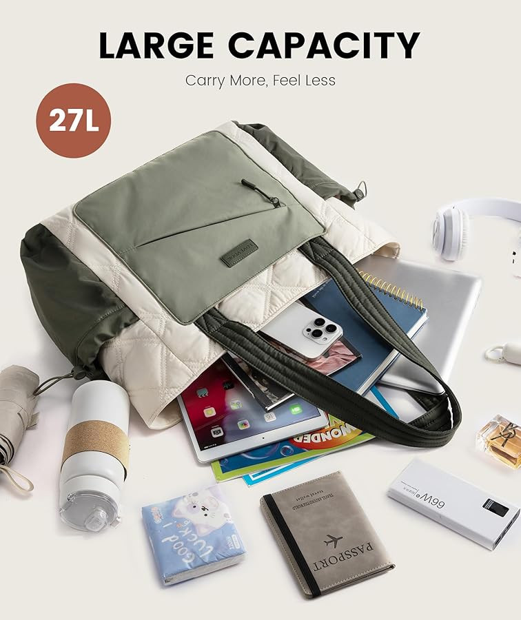 【Spacious Design with Smart Organization】 With dimensions of 16 x 12.8 x 6.2 inches, this tote offers large capacity without the bulk. Multiple internal and external pockets keep your laptop, water bottle, and other travel essentials neatly organized.