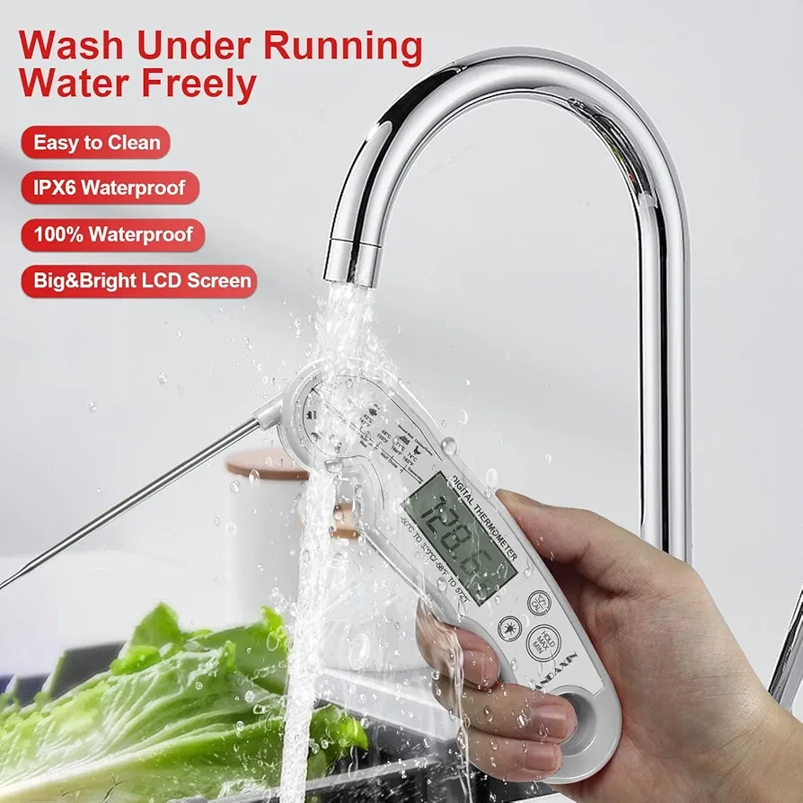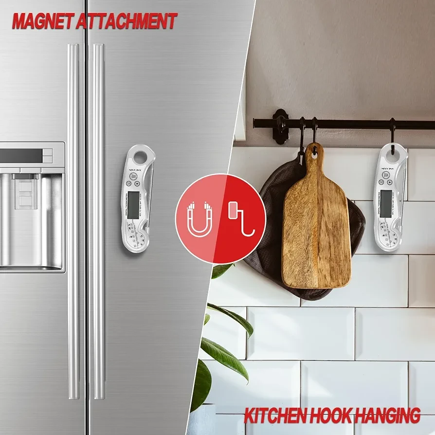 • [Waterproof and Durable] - IP65 rated waterproof, the thermometer can be washed under running water without fear! With a strong ABS plastic body, it can withstand accidental drops or other impact accidents. And features a magnetic back to allow for placement on any metal surface or use the hang hole for hooks.