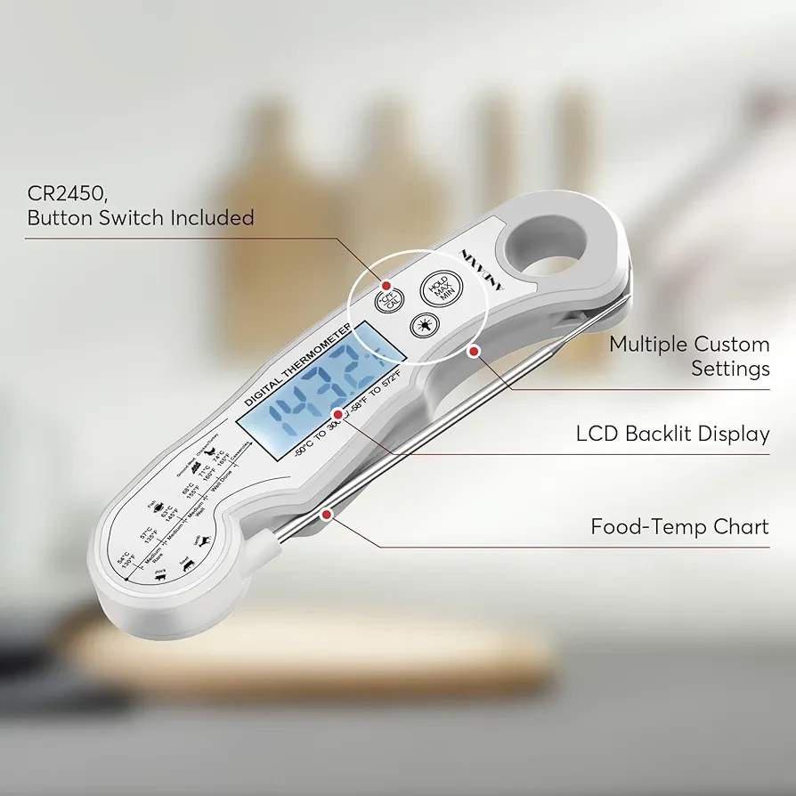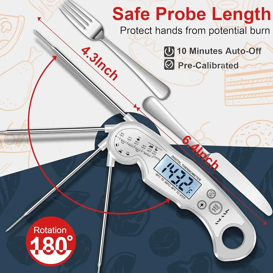 • [Backlight display] - Grilling thermometer features backlight LCD display to let you see clearly while cooking in the evening, indoors or outdoors.