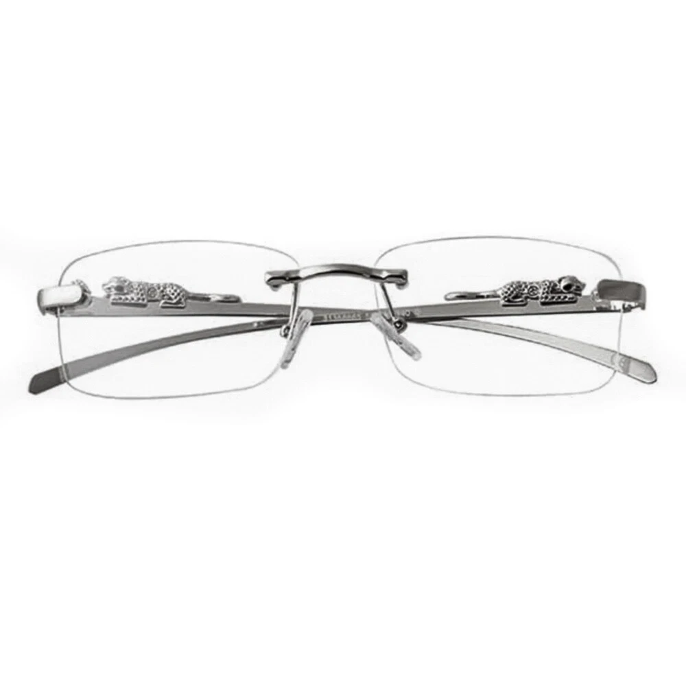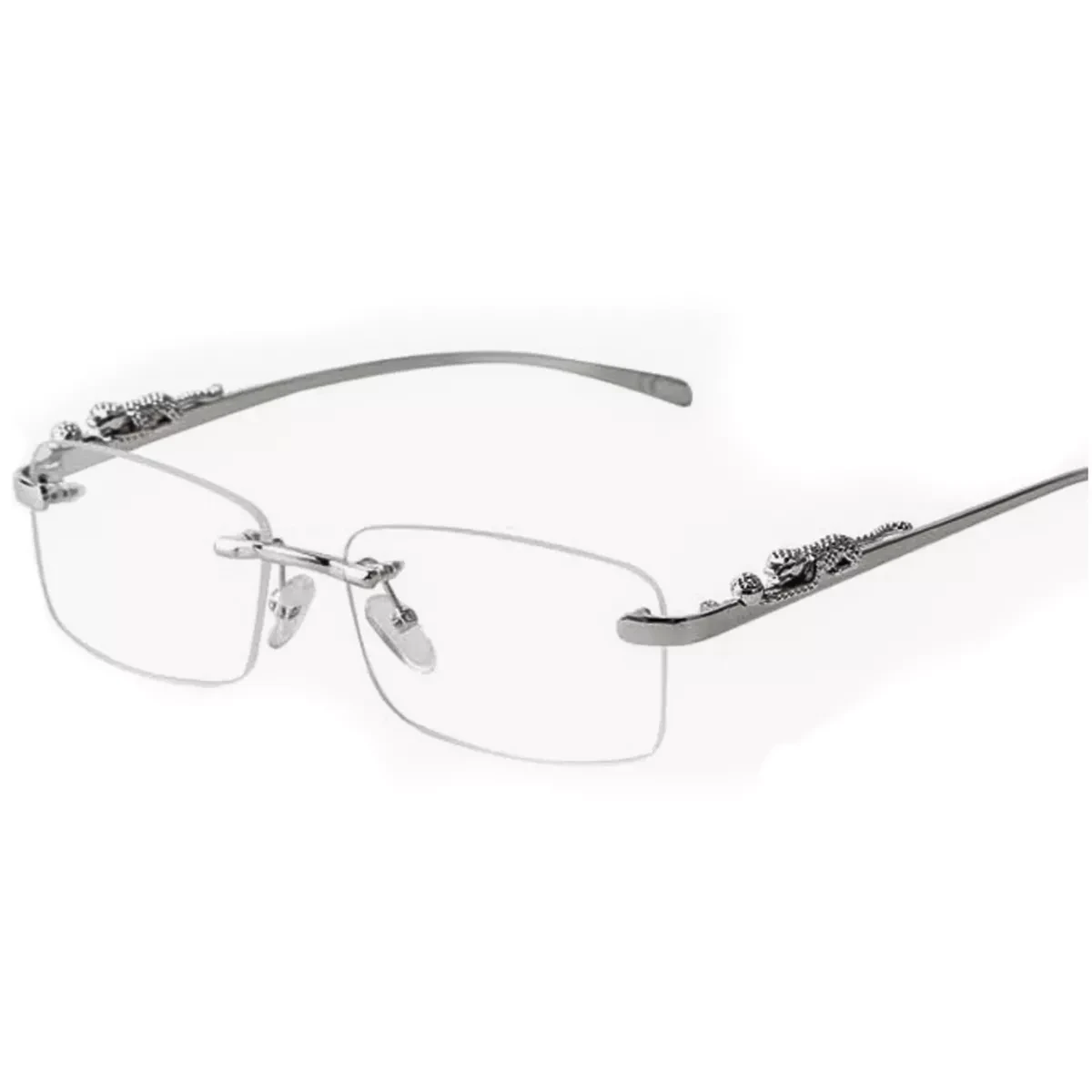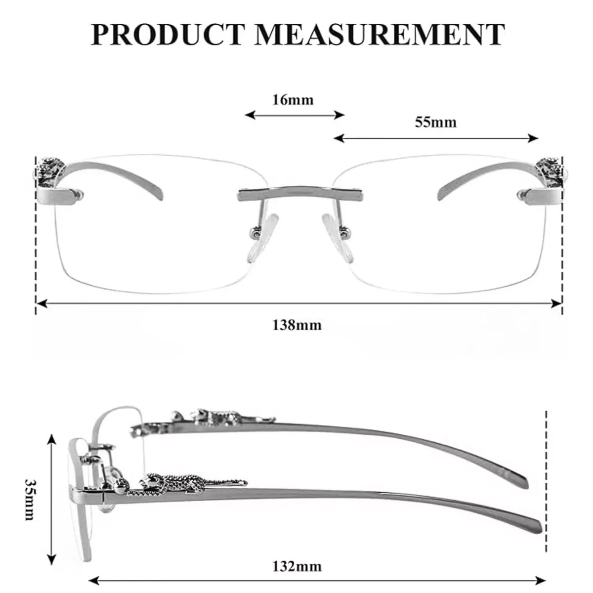 Unisex Trendy 90’s Hip Hop Retro Vintage Small Rimless Square Silver Wire Metal Frames Luxury Leopard Arms Frameless Glasses Rectangle Designer Narrow Clear Lens Eye Glasses For Men And Women.