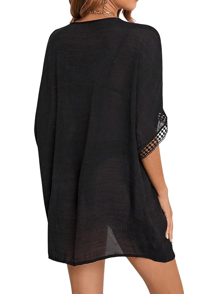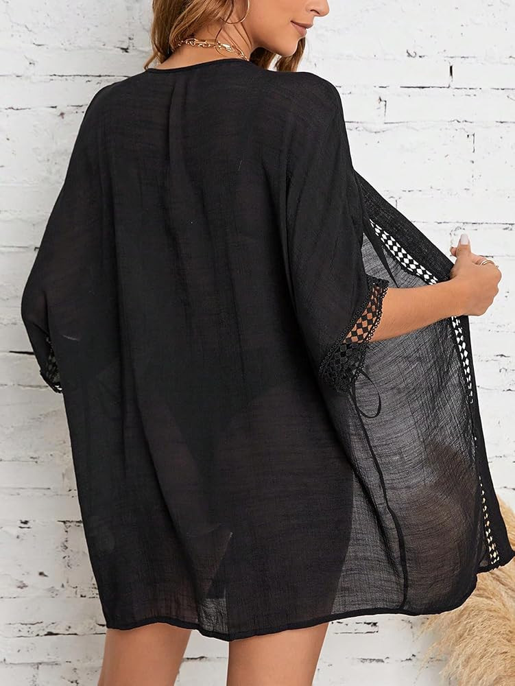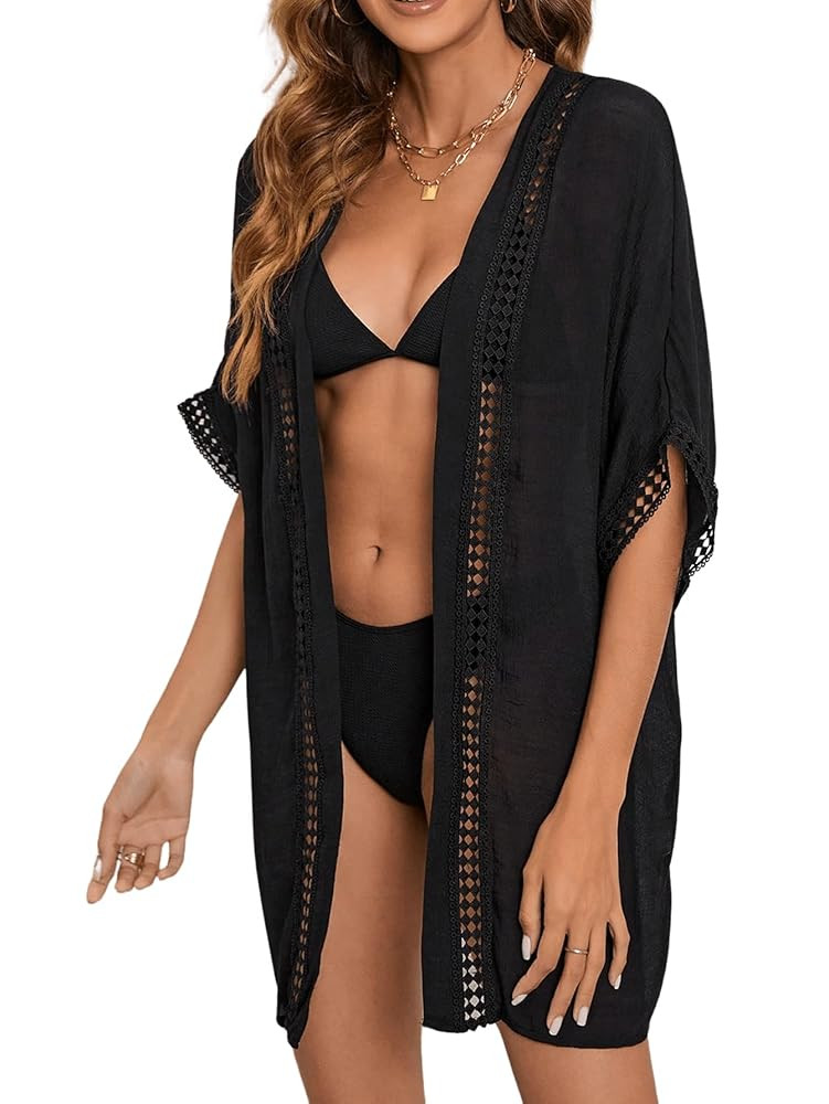 Feature: Hollow Out Trim, Open Front, Dolman Sleeve, Thigh Length, Plain, Kimono Cover Ups for Women
