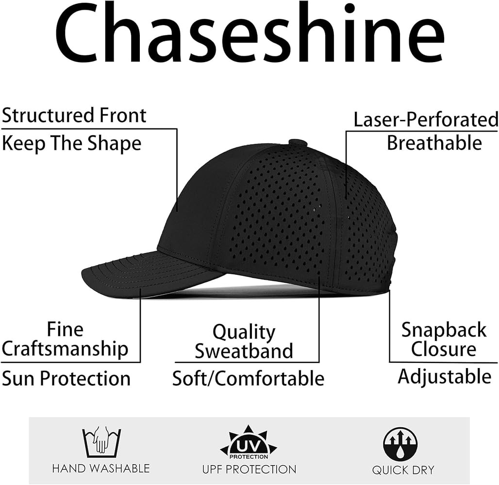 Chaseshine Hat Design: Stylish and functional,structured front panels that maintains shape, 6-panel, curved brim, laser-perforated side & rear panels for breathability, and soft touch adjustable snapback closure