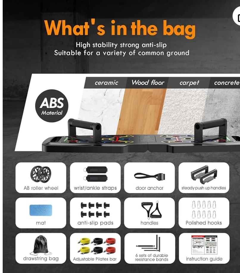 【Fitness System for Anyone】Versatile home portable fitness device, We've kept the professional push up straining, Added foldable fitness bars and wrist/ankle straps, Ab roller wheel and 6 resistance bands so You can perform more exercises. Light but stable enough. You can choose the intensity according to your ability.