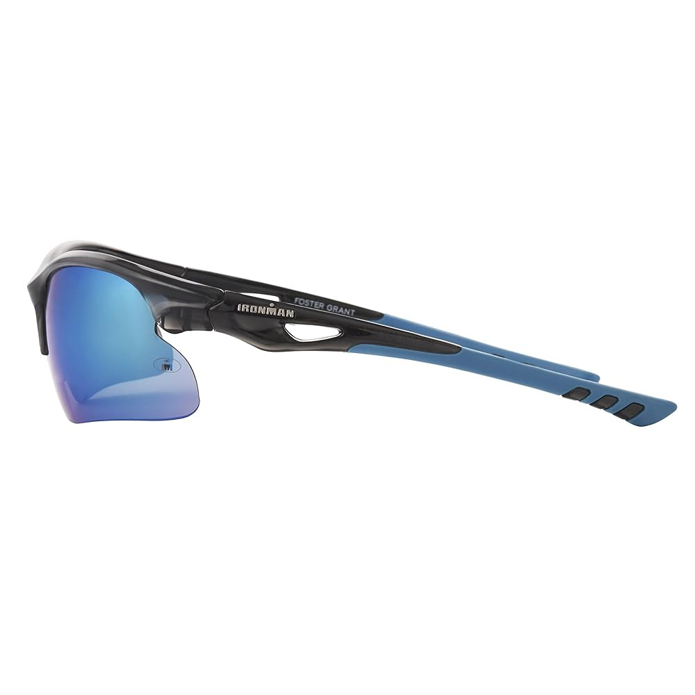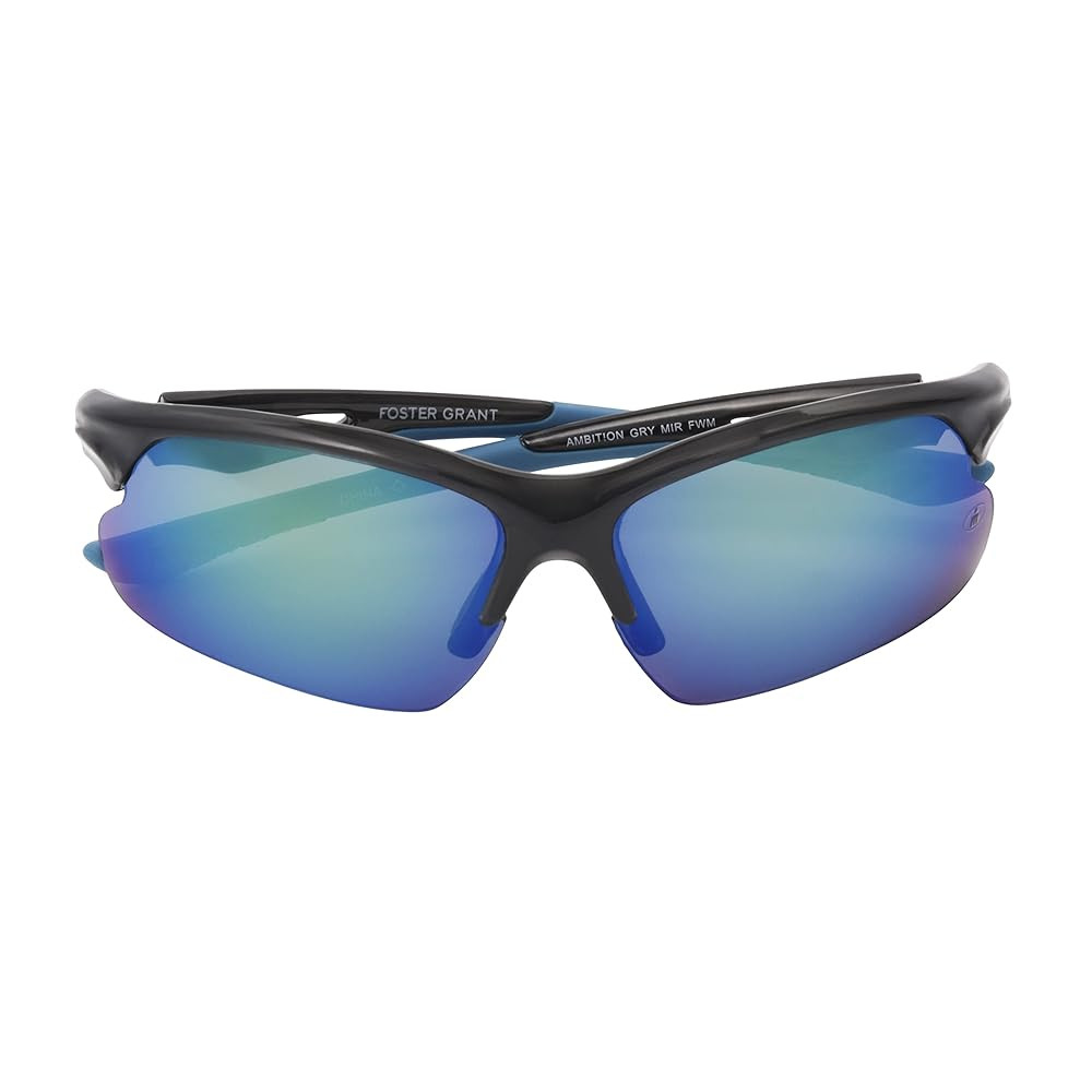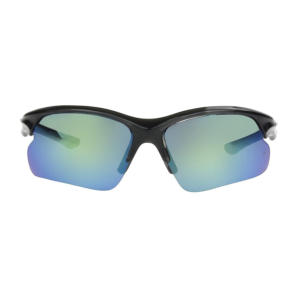 The Ambition Ironman sport shades for men provide 100% UVA/UVB eye protection in a blade-style frame made out of shiny crystal grey plastic, so you can focus on the game, not the blinding sun. Dark teal rubber tips accent the arms of these rectangle sunglasses for men and, together with the grey rubber nose pads, help to hold the golf and baseball sunglasses securely in place, so they won't fall off when you're playing hard. For the ultimate in style and performance, the green lenses with citron-turquoise mirror are also scratch- and impact-resistant with a hydrophobic coating that helps them to repel water. Ironman baseball and golf sunglasses for men are the ultimate triple-threat in durability, fit, and protection.