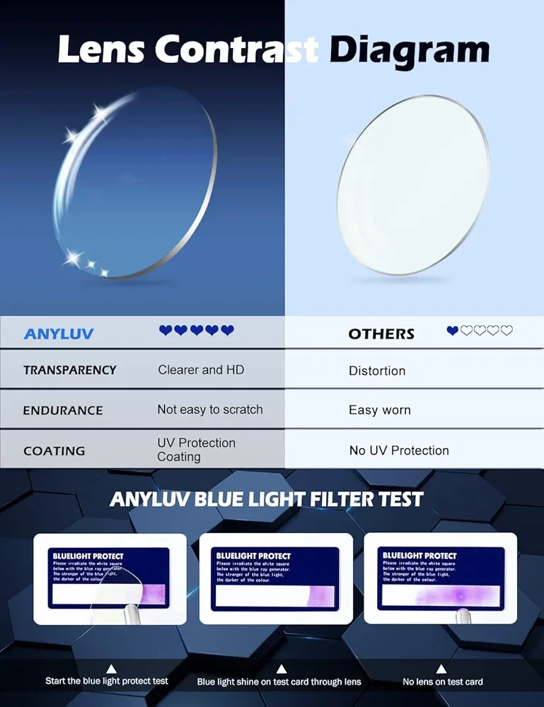 45% Blue Light Reader: Give your look a real pop with ANYLUV glasses.ANYLUV reading glasses with magnification can effectively improve the ability to read something up close, such as a book or a computer screen. And the lens helps to filter 45% of potentially harmful blue light produced by computers and other devices. So,keep your glasses on when you shift between reading and looking up to see across the room or interact with others