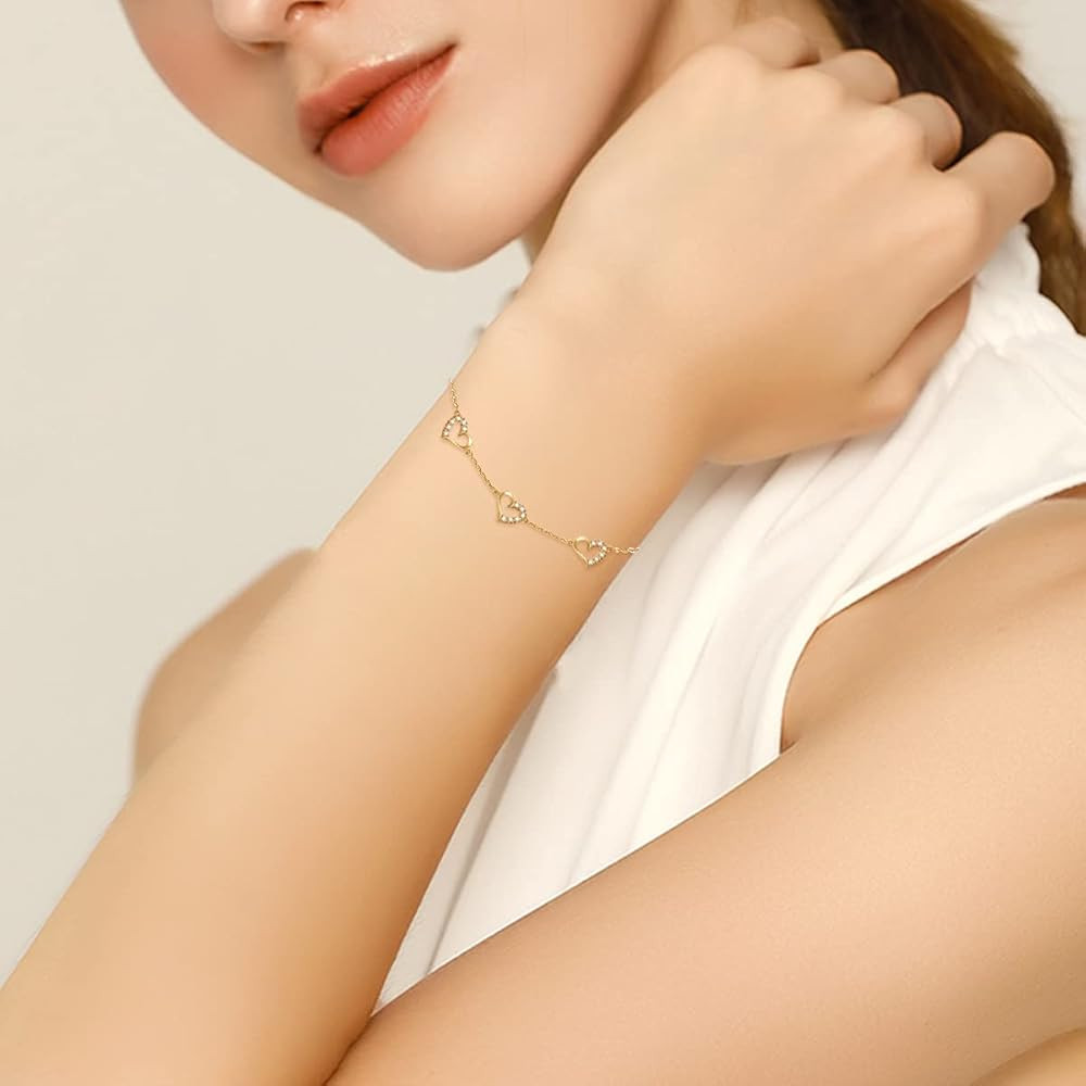 • 【Design】 Three sweet heart shaped decorated with CZ stones, this yellow gold bracelet means the love between you and her.
