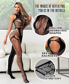 Stylish Design: Featuring a sleeveless cut with a round neckline and daring open back, this women's exotic lingerie bodystockings flaunts a geometric fishnet pattern. The chest, crotch, and inner thigh areas are lined with opaque mesh for subtle coverage, providing a contrast to the bold fishnet look, while still leaving plenty to the imagination;