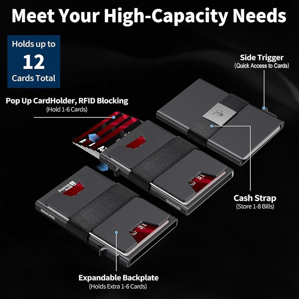 Slim Aluminum Card Holder Wallet for Men, Durable Expandable Backplate, RFID Blocking Minimalist Metal Pop Up Wallet, Holds 12+ Cards Plus Cash (Black)