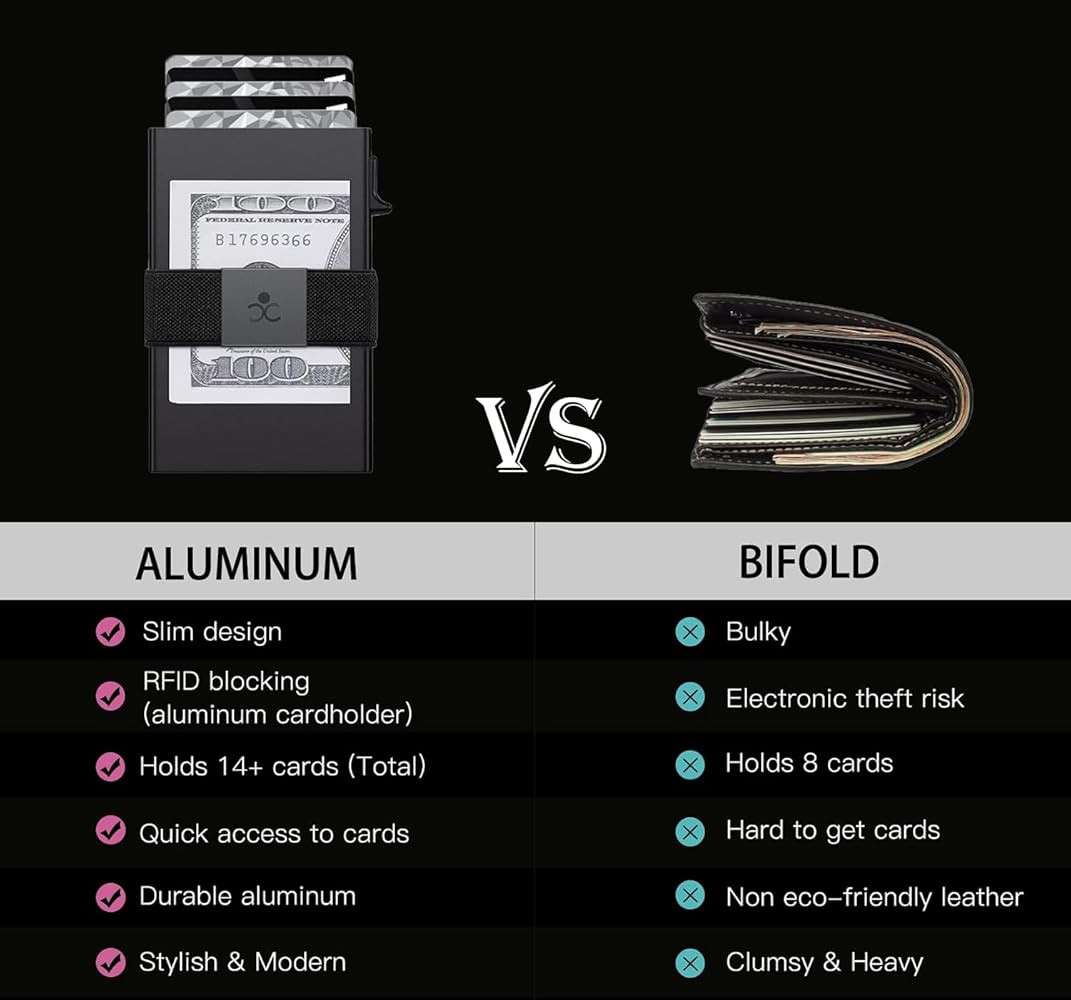 • ? RFID & NFC BLOCKING: This smart wallet use advanced aluminium technology to protect your cards from unauthorized and contactless scanning. Stop thieves from cloning your bank cards and prevent data theft.