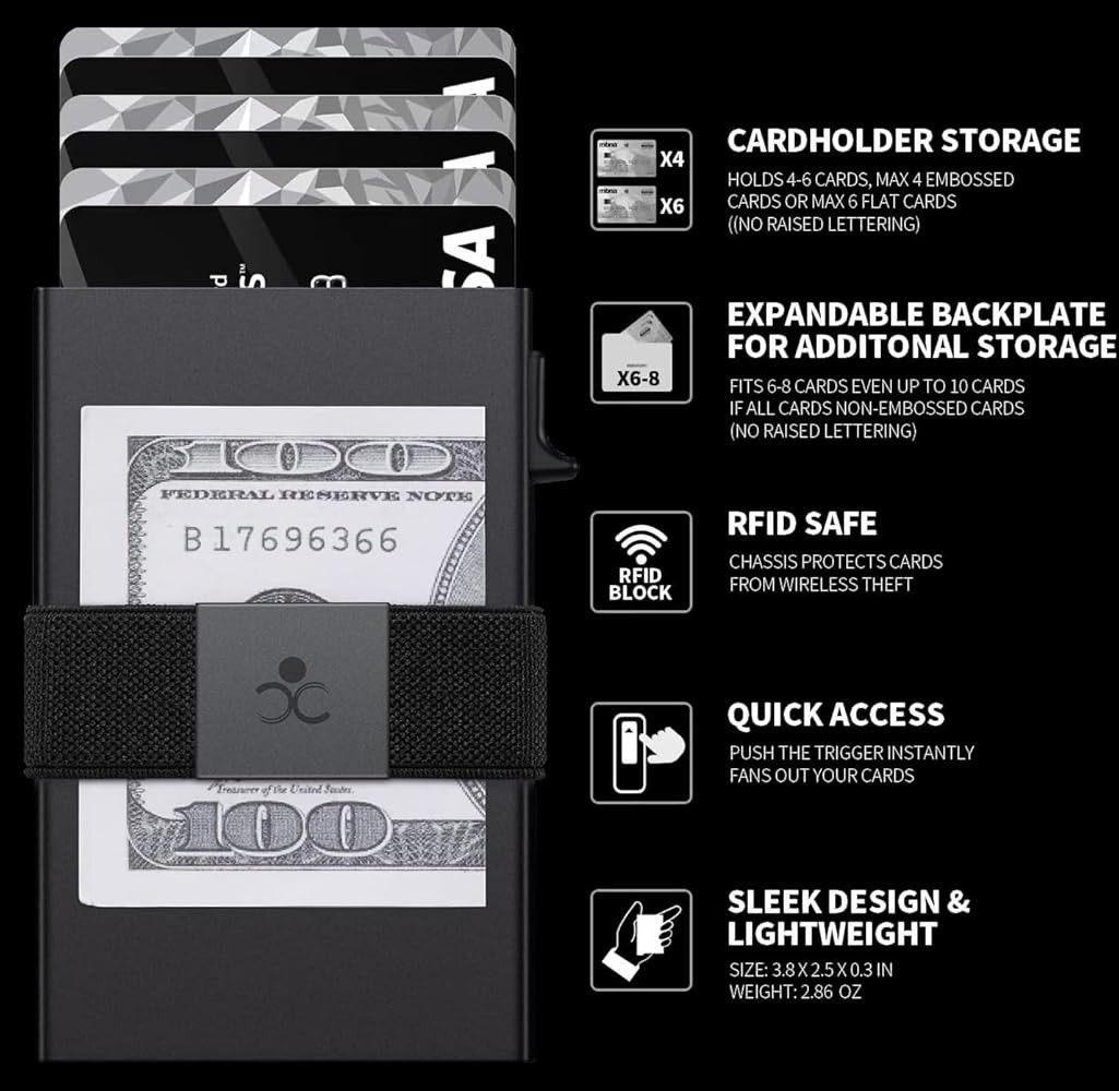 ? QUICK ACCESS & LARGE CAPACITY HOLD UP 1-12 CARDS: This mens wallet designed with enhanced enjection mechanism button to pop up cards quickly. The aluminum card holder holds 4-6, depends on the number of embossed cards, and the expandable metal backplate holds 5-6 additional cards. The actual capacity depends on the card thickness.