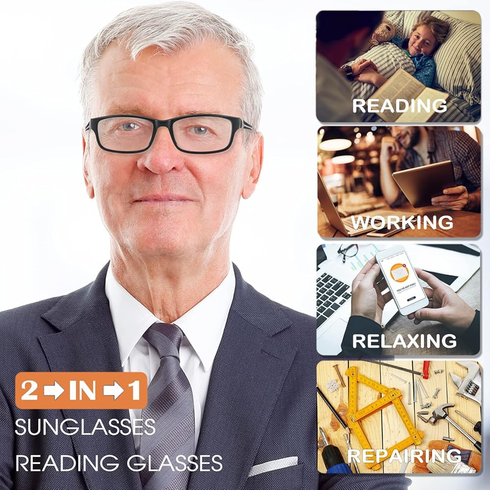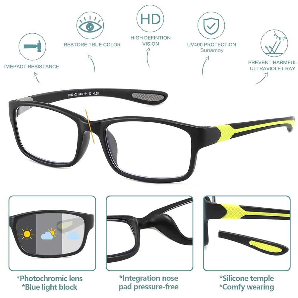 Photochromic Reading Glasses for Men: Photochromic reading glasses change color quickly and switch freely both for Indoor and Outdoor. Darkens lens to grey based on sunlight and ultraviolet light. Outdoors are full reader sunglasses, and indoors are reading glasses. Readers work comfortably on sunny weather, readers also can take it do outdoor sports, such as running, cycling, hiking, fishing, driving and so on. The lens will return to colorless and transparent within a few minutes
