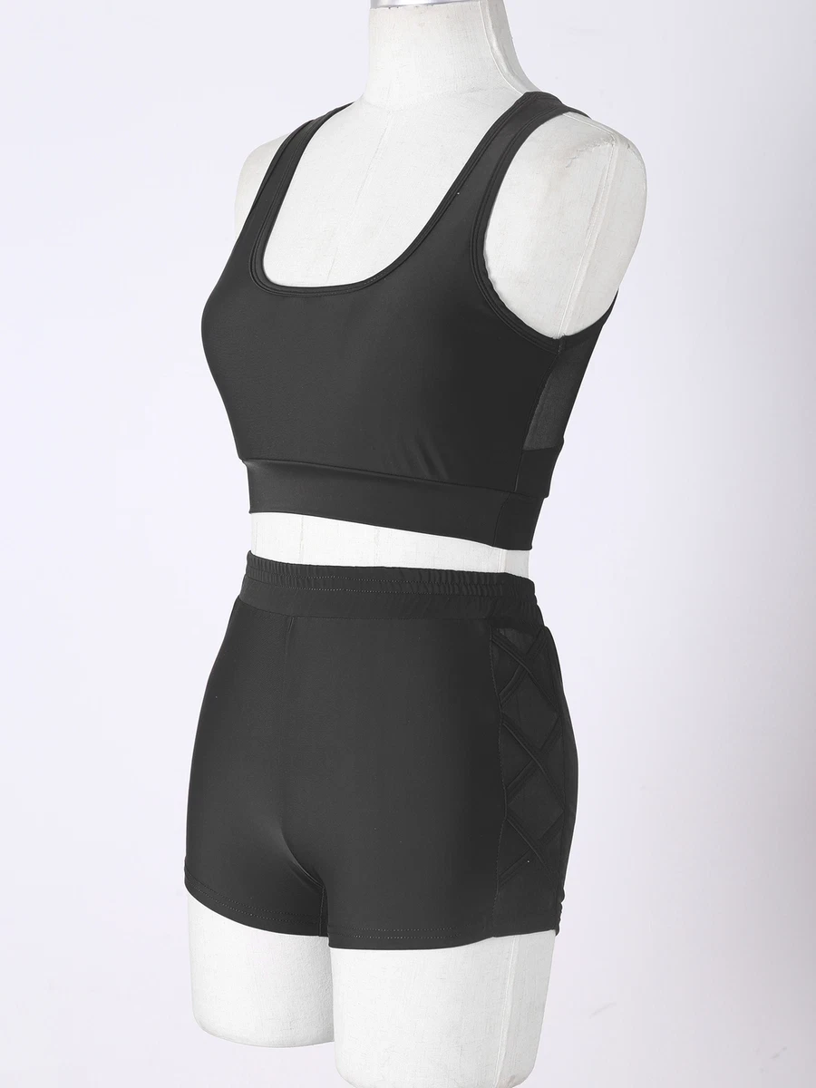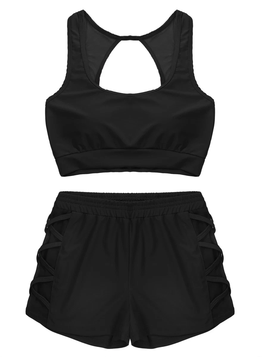 Scoop neck and racerback, with irremoveable padded wirefree crop top, mesh back.
