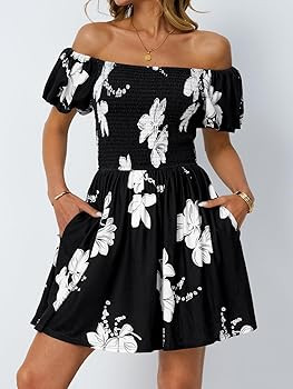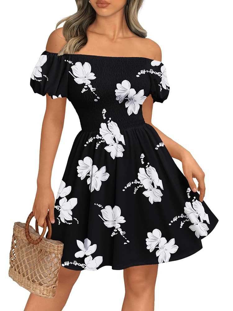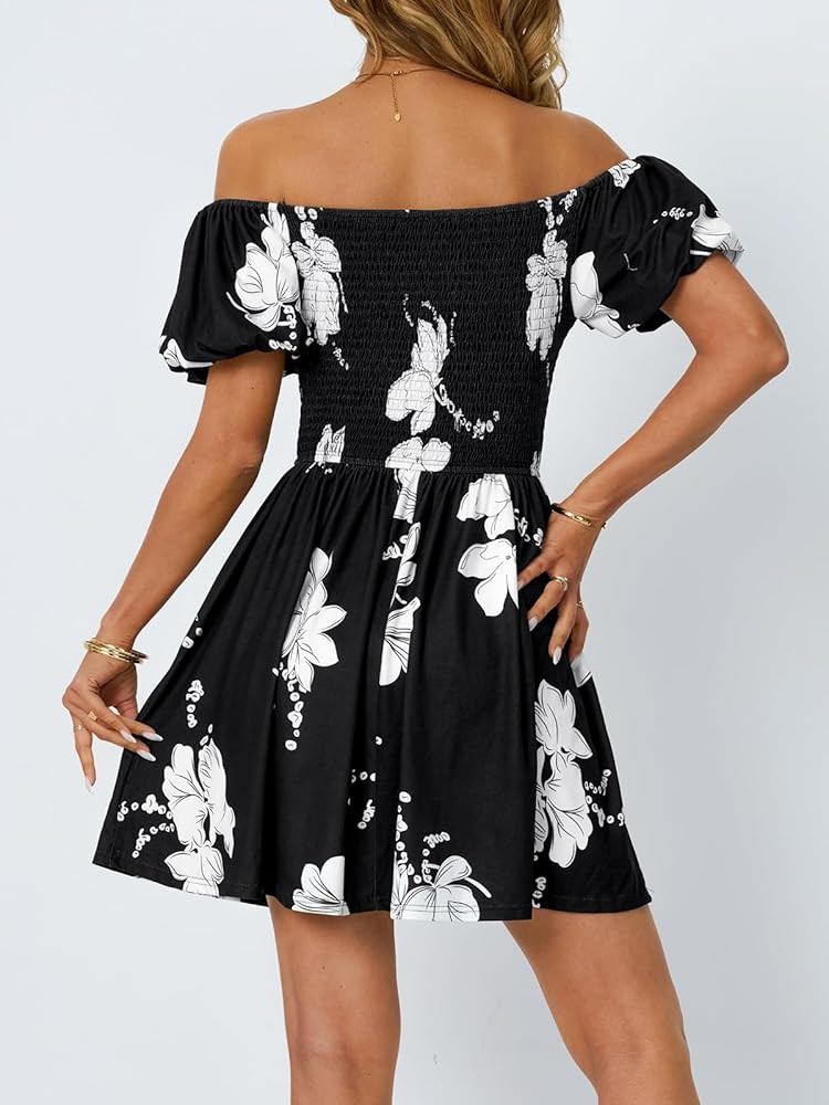 Feature:This women's beach dress is a stunning combination of elegance and comfort. It features an off-the-shoulder neckline that gracefully frames your shoulders, paired with charming short puffy sleeves that add a touch of playfulness.High-waisted, tummy-skimming design accentuates your figure. The beautiful floral pattern adds a vibrant touch, perfect for sunny days and parties.