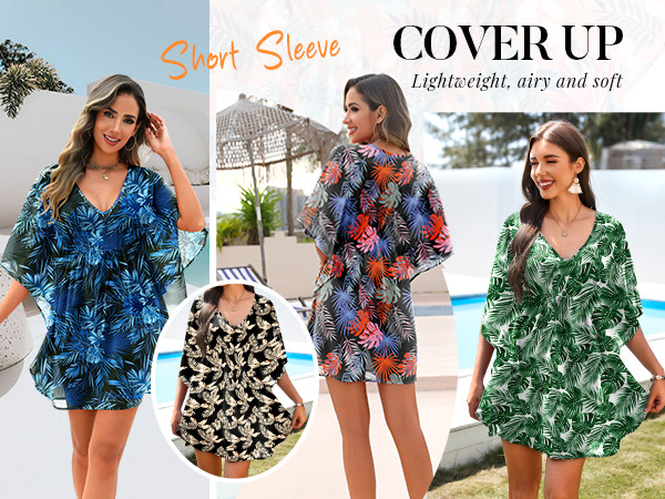 Beach Cover Ups for Women: Deep V-neck, 3/4 sleeve, mini dress length. Tie Waist drawstring design, allowing you to adjust the fit to your liking