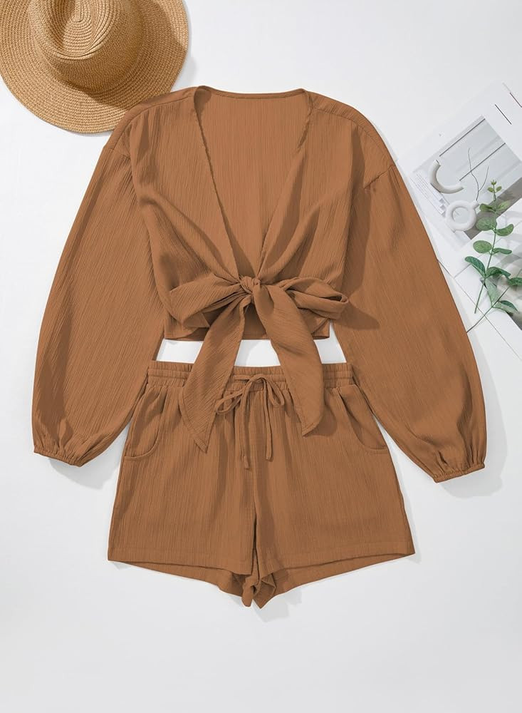 Feature: The long sleeve crop top boasts a trendy tie knot front can be adjusted for a customized fit, v neck adds a touch of allure. The high waist elastic waistband shorts, complete with side pockets and drawstring, ensure comfort and practicality