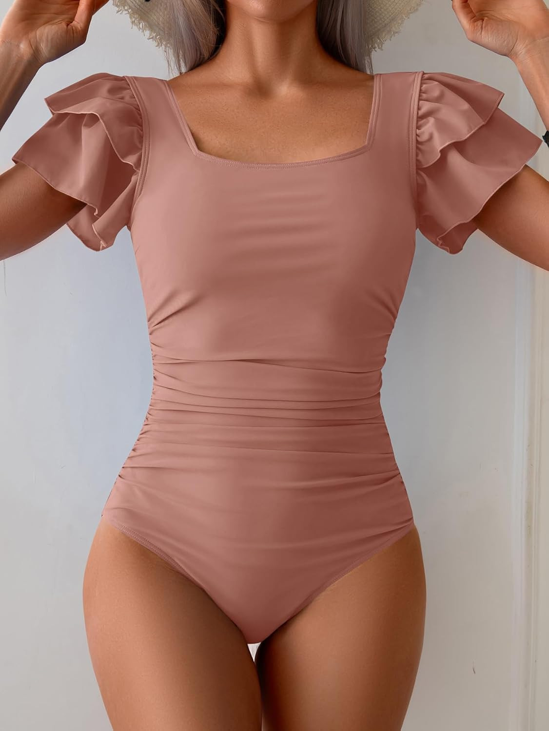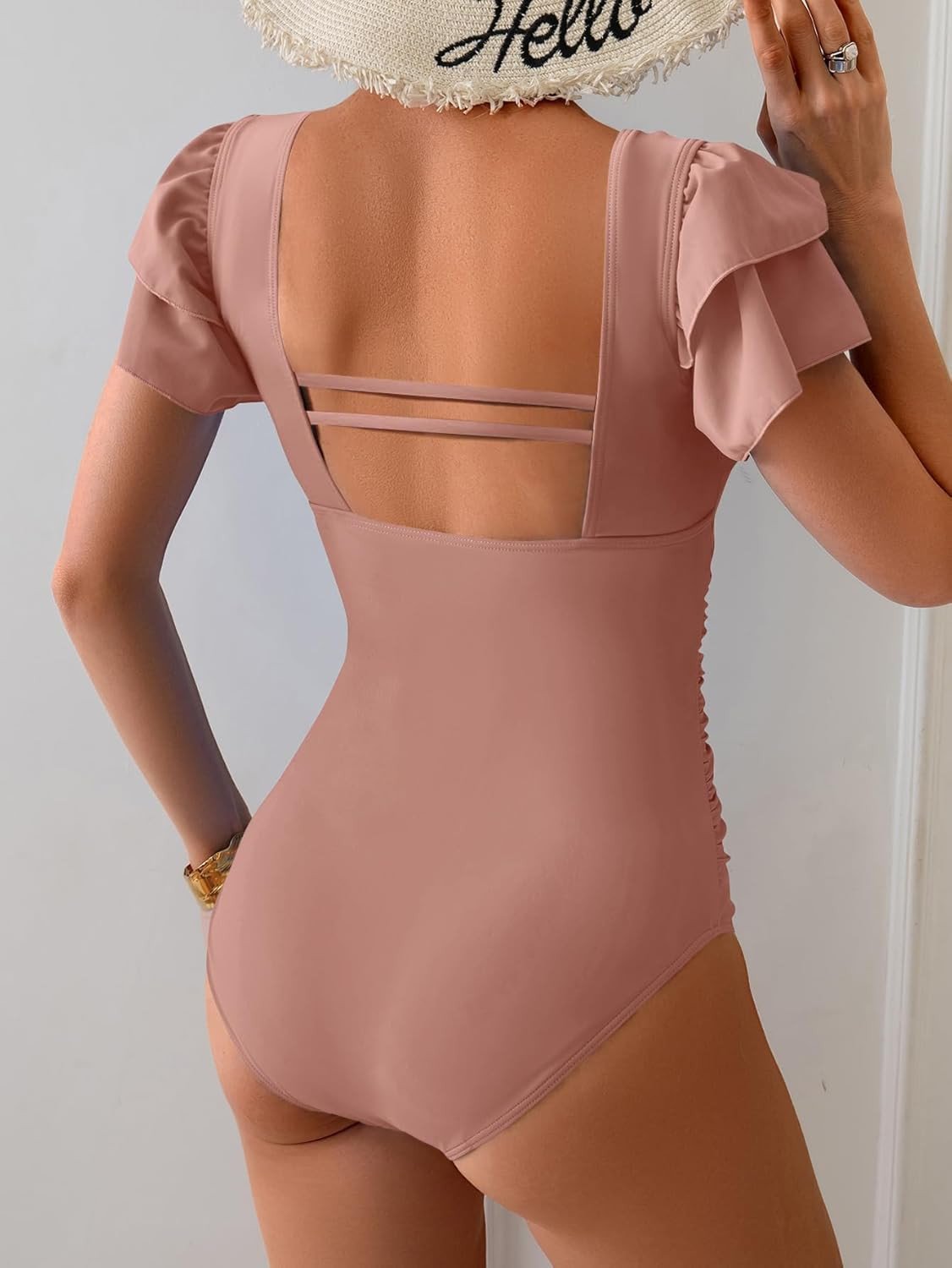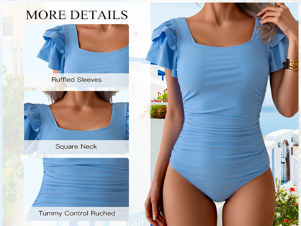 Ruffle One Piece Bathing Suit: The ruffled sleeve of this swimsuit can better cover the arms, making them look slimmer and longer. The square neck and hollow-out back design offers a sexy and vintage look, making you stand out in the crowd